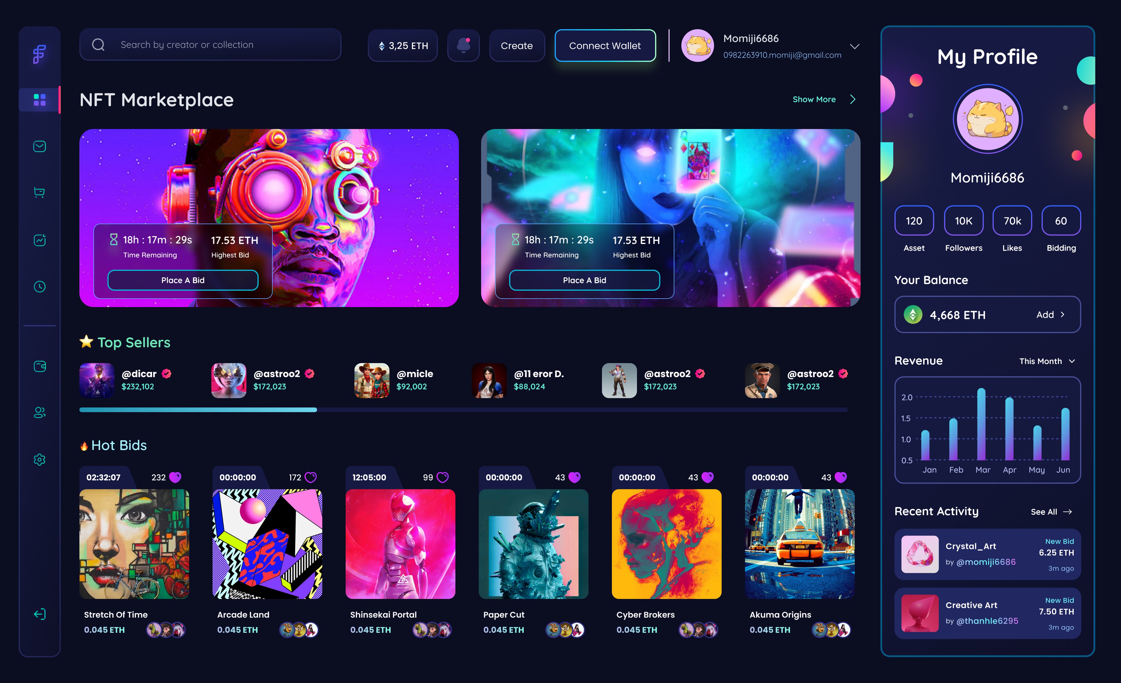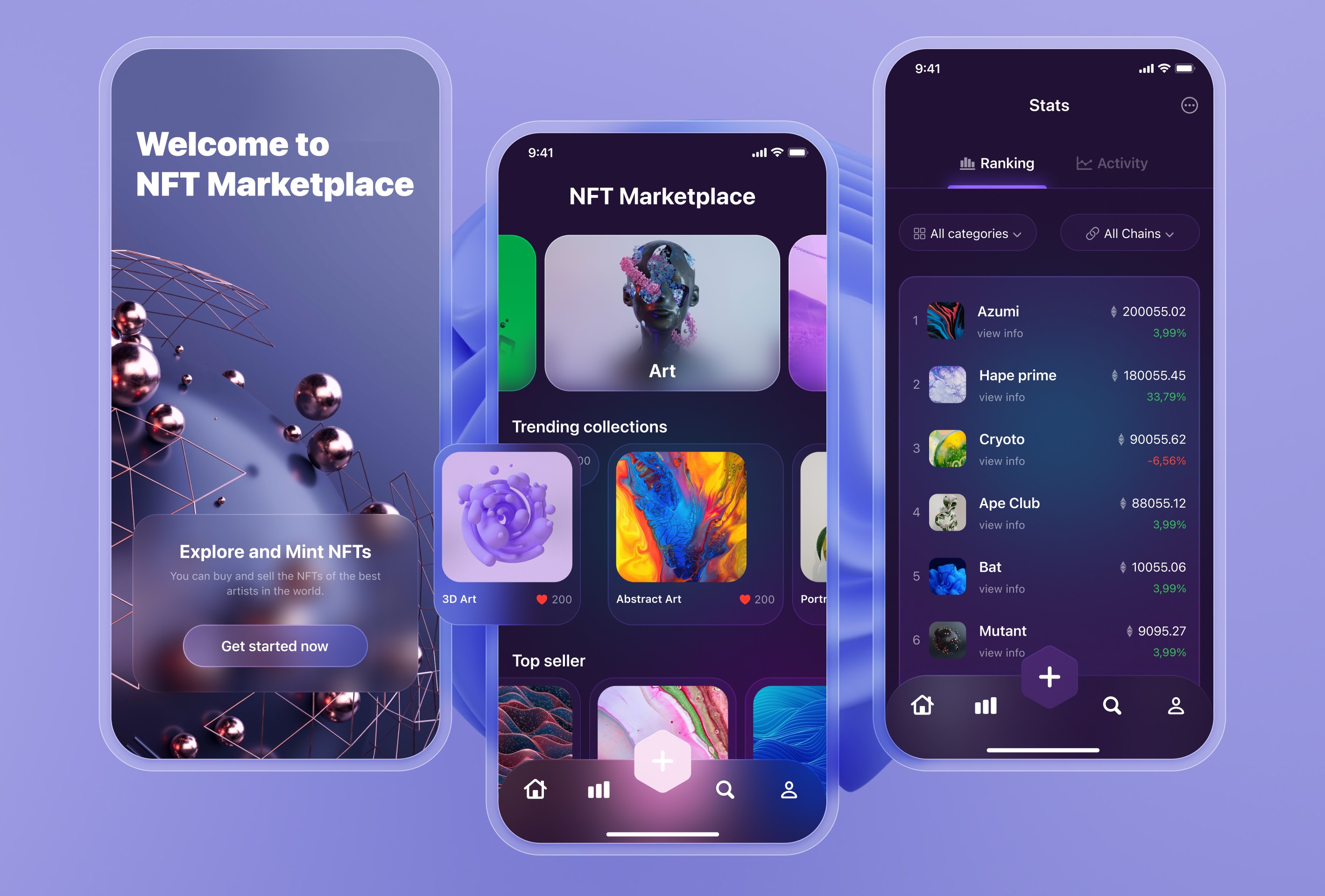 UI design and prototyping for an NFT marketplace, showcasing a seamless and interactive user experience on desktop & mobile.